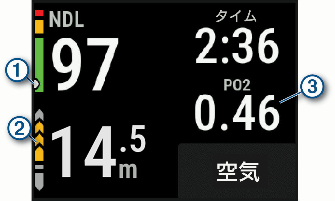 メインダイビングデータページ:メインダイブデータ項目(ガスの種類、浮上/潜降スピード、現在の深度)を表示します。NEXTキーを押してダイビングコンパス( ダイビングコンパスを使用する)やその他のデータ項目(最大深度、浮上時間(TTS)、時刻、現在の温度)を表示します。