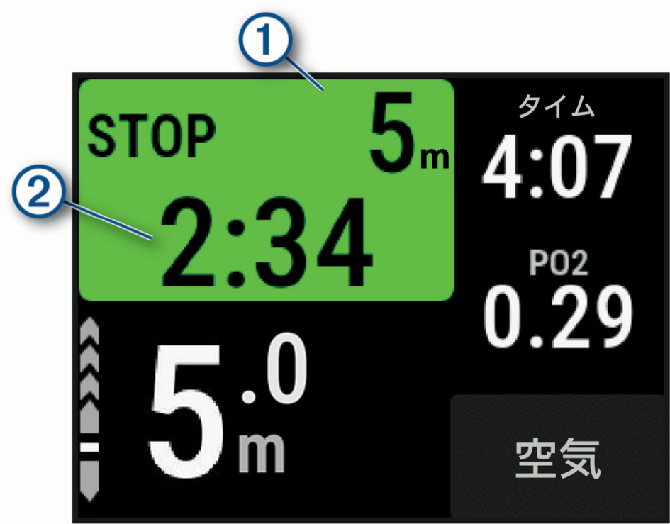 安全停止タイマー シーリング深度の1m(5ft)以内に浮上するとタイマーのカウントダウンが開始します。 |