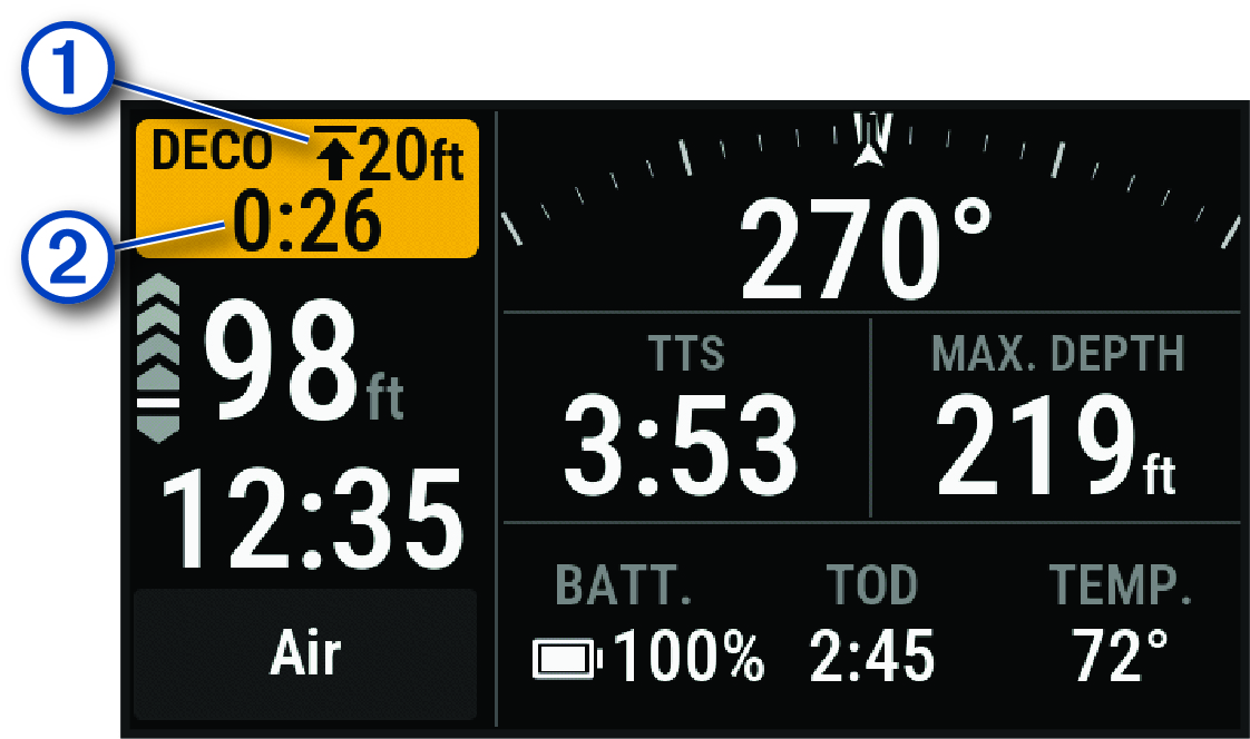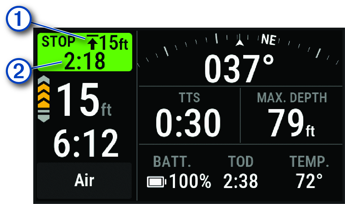 NOTE: If you ascend more than 0.6 m (2 ft.) above the decompression stop ceiling depth, the decompression stop timer pauses, and the device alerts you to descend below the ceiling depth. The depth and ceiling depth flash red until you are within the safe margin.