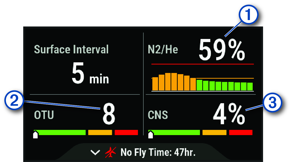 The surface interval app shows your nitrogen (N2) and helium (He) tissue load level, current oxygen toxicity units (OTU), and central nervous system (CNS) percentage.