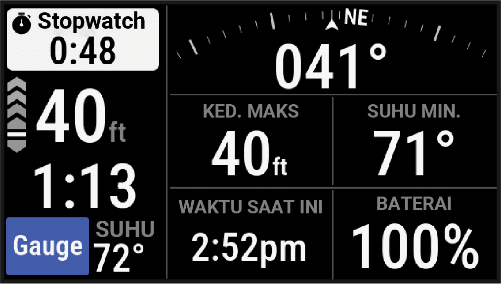 Layar data utama untuk mode selam gauge menampilkan data untuk penyelaman saat ini, termasuk kedalaman maksimum, suhu terendah dalam 24 jam terakhir, waktu saat ini, dan stopwatch (Menggunakan Stopwatch Selam Gauge). Anda dapat menekan tombol NEXT untuk melihat kompas selam dalam layar penuh (Menavigasi dengan Kompas Selam).