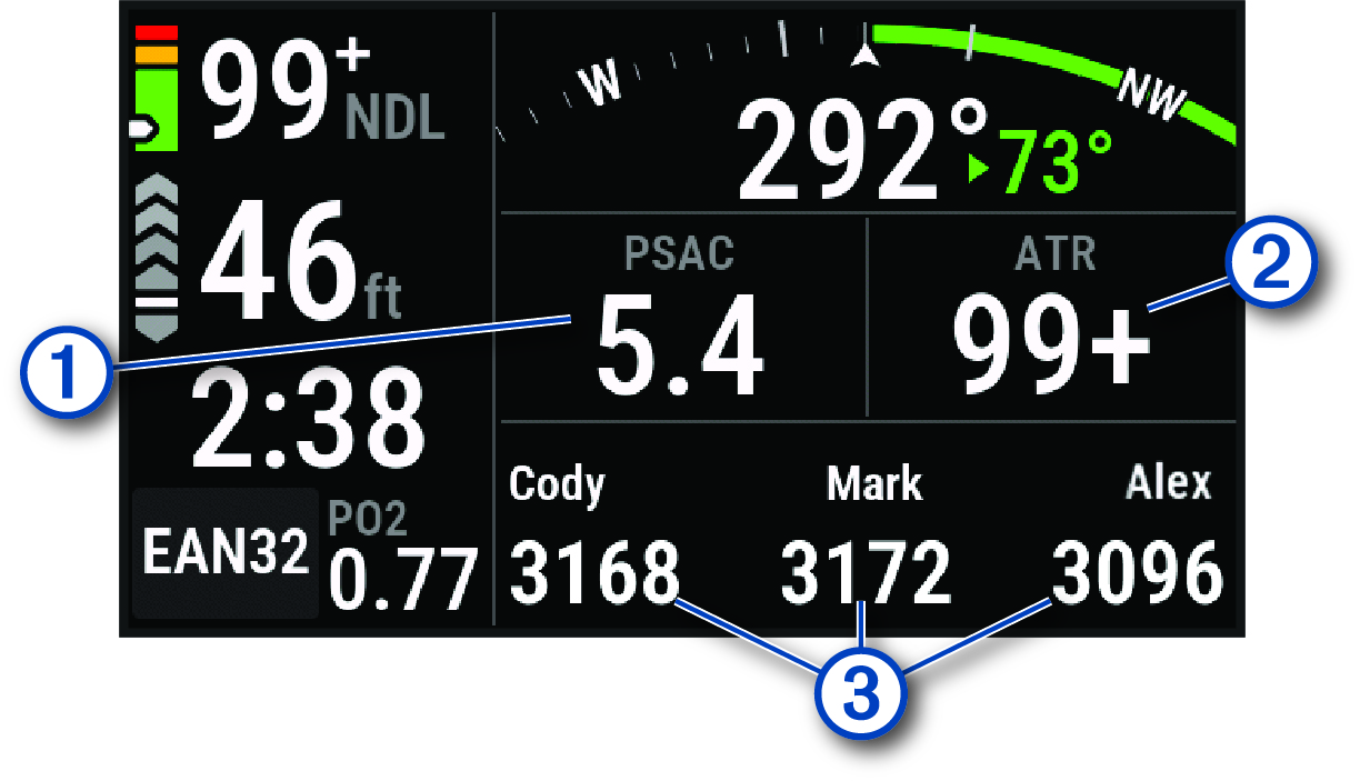 Transceiver tersemat Anda dan nilai tekanan tangkinya. CATATAN: Anda dapat menyesuaikan transceiver mana yang ingin ditampilkan (Memilih Transceiver yang Ingin Dilihat Selama Menyelam). |