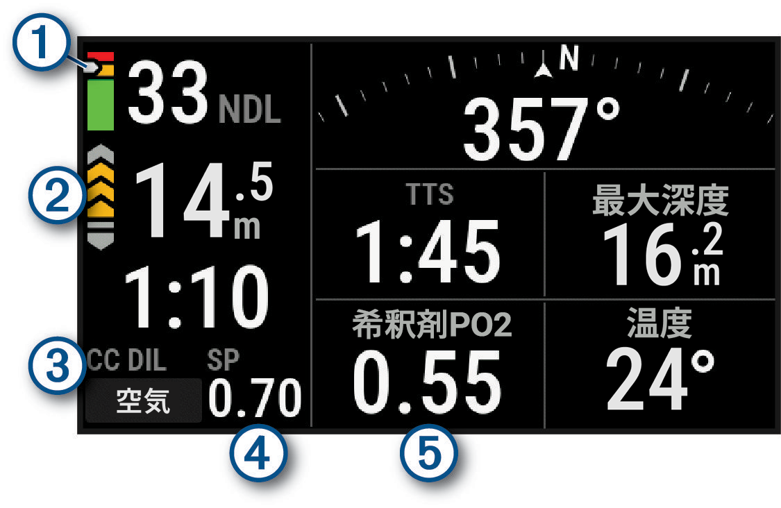 メインダイビングデータページ:メインダイブデータ項目(ガスの種類、浮上/潜降スピード、最大深度、浮上時間(TTS)、時刻、現在の温度)を表示します。NEXTキーを押してダイビングコンパスを表示します。( ダイビングコンパスを使用する)