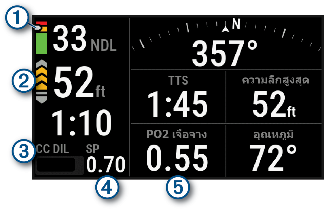 ระบุว่าการดำน้ำแบบวงจรปิด (CC) หรือวงจรเปิด (OC) ทำงานอยู่ |