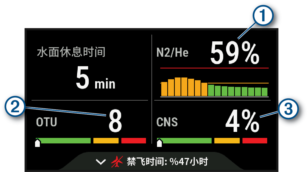 查看水面间隔应用水面间隔应用将显示您的氮(N2) 和氦(He) 组织负荷水平、当前氧毒性单位(OTU) 和中枢神经系统(CNS) 百分比。注意:潜水期间累积的 OTU 将在24小时后失效。 选择 SI。 ① 绿色:0~79% 黄色:80~99% 红色:100%或更高 ② 绿色:0~249 OTU 黄色:250 ~ 299 OUT 红色:大于或等于300 OUT ③ 绿色:0~79% CNS%。 黄色:80~99% CNS%。 红色:大于或等于100% CNS%。 按下 NEXT 键可查看禁飞剩余时间和禁飞期结束的时间。 主页潜水气体整合查看水面间隔应用