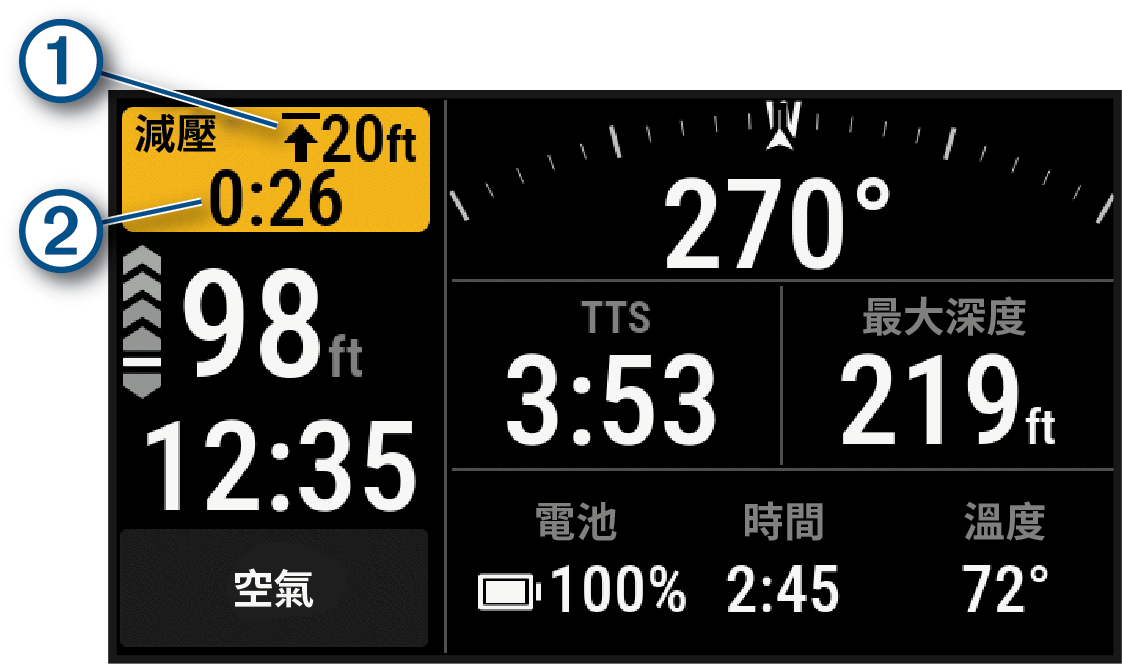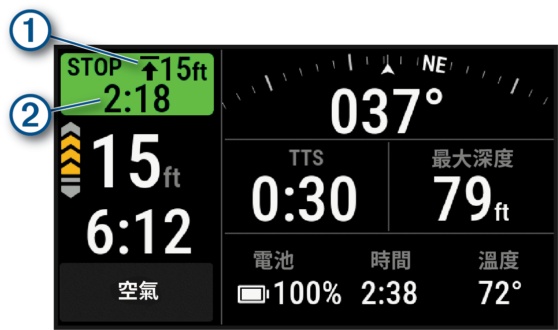 備註:如果您上升到超過減壓停留深度上限 0.6 公尺以上,減壓停留計時器將會暫停,且裝置會提醒您下潛至減壓停留深度上限以下。深度與深度上限將會閃紅直到您回到安全的深度。