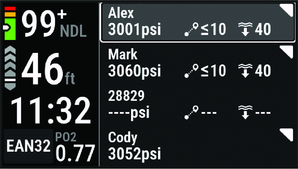 - 按下 ENTER 鍵,然後選擇 潛水員 以檢視氣瓶壓力值、大概深度,以及與網路中配對的 Descent 發射器的大概距離。