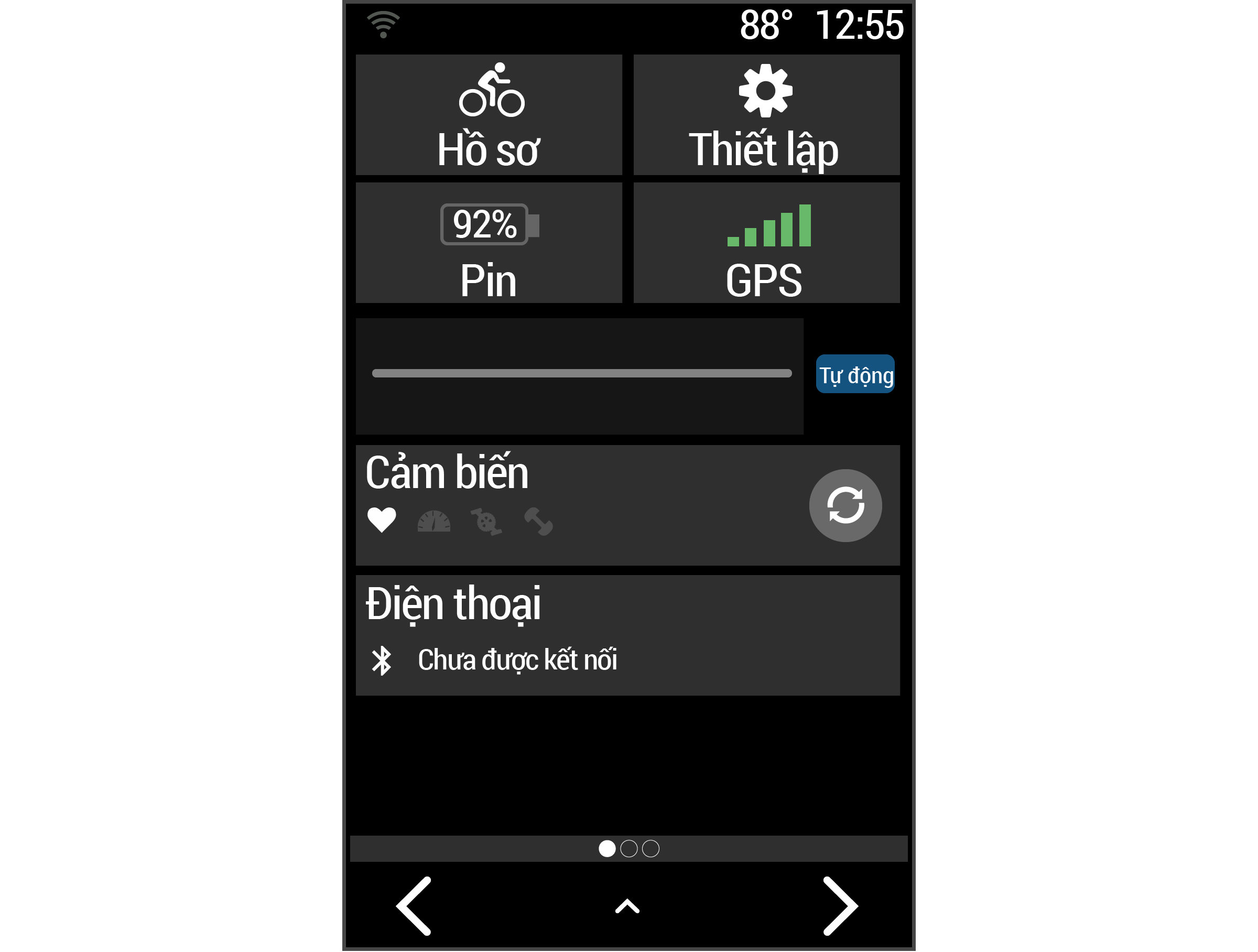 Công cụ thiết lập xuất hiện. Một biểu tượng nhấp nháy nghĩa là thiết bị đang tìm tín hiệu. Một biểu tượng cố định có nghĩa là tín hiệu được tìm thấy hoặc cảm biến được kết nối. Bạn có thể chọn biểu tượng bất kỳ để thay đổi thiết lập.
