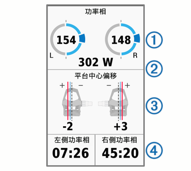 - 滑动屏幕到骑行动态页面,以查看您的功率峰值分布 ①、功率总值 ② 和踩踏施力偏移 ③。