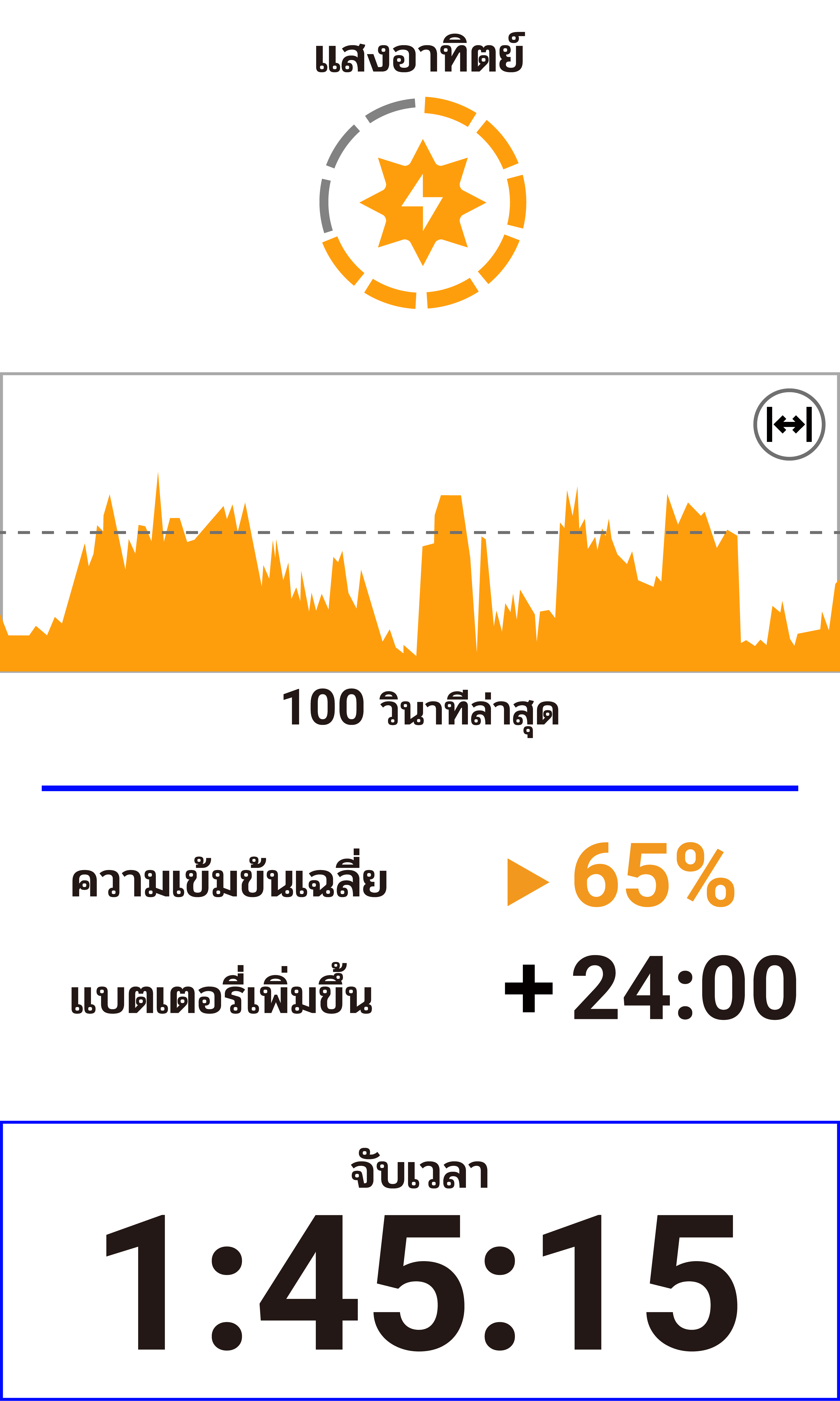 หน้าข้อมูลโซลาร์ไฮไลท์ความเข้มข้นของสภาพแสงปัจจุบันและเวลาการปั่นสะสมที่ได้จากพลังงานแสงอาทิตย์ การคำนึงถึงการใช้งานปัจจุบันและการใช้แบตเตอรี่ของอุปกรณ์