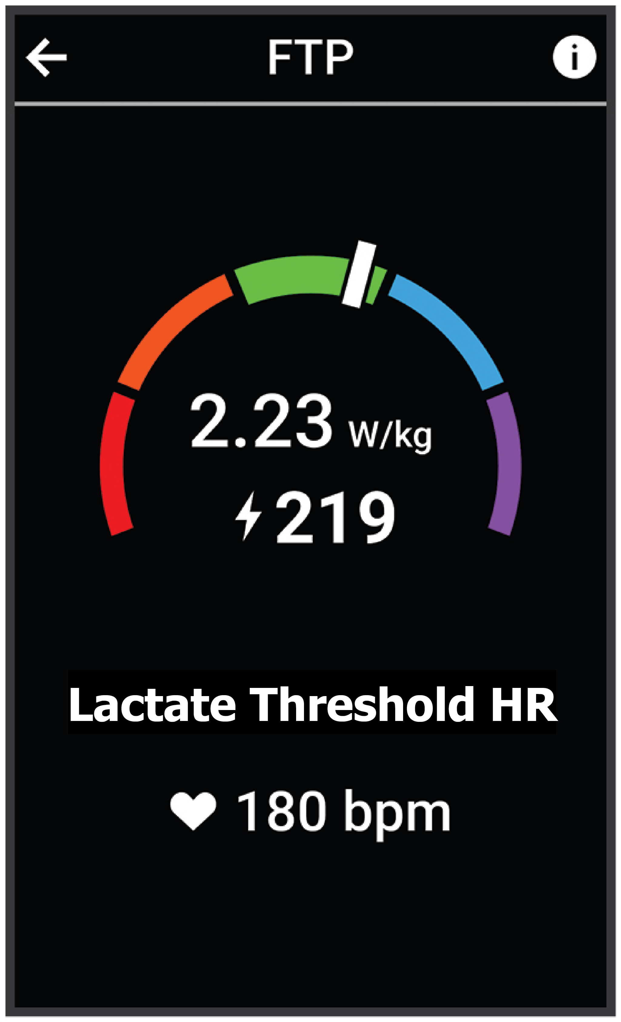 ค่า FTP ของคุณปรากฏเป็นค่าที่ถูกวัดเป็นวัตต์ต่อกิโลกรัม กำลังเอาต์พุตของคุณเป็นวัตต์ และตำแหน่งบนมาตรวัดสี