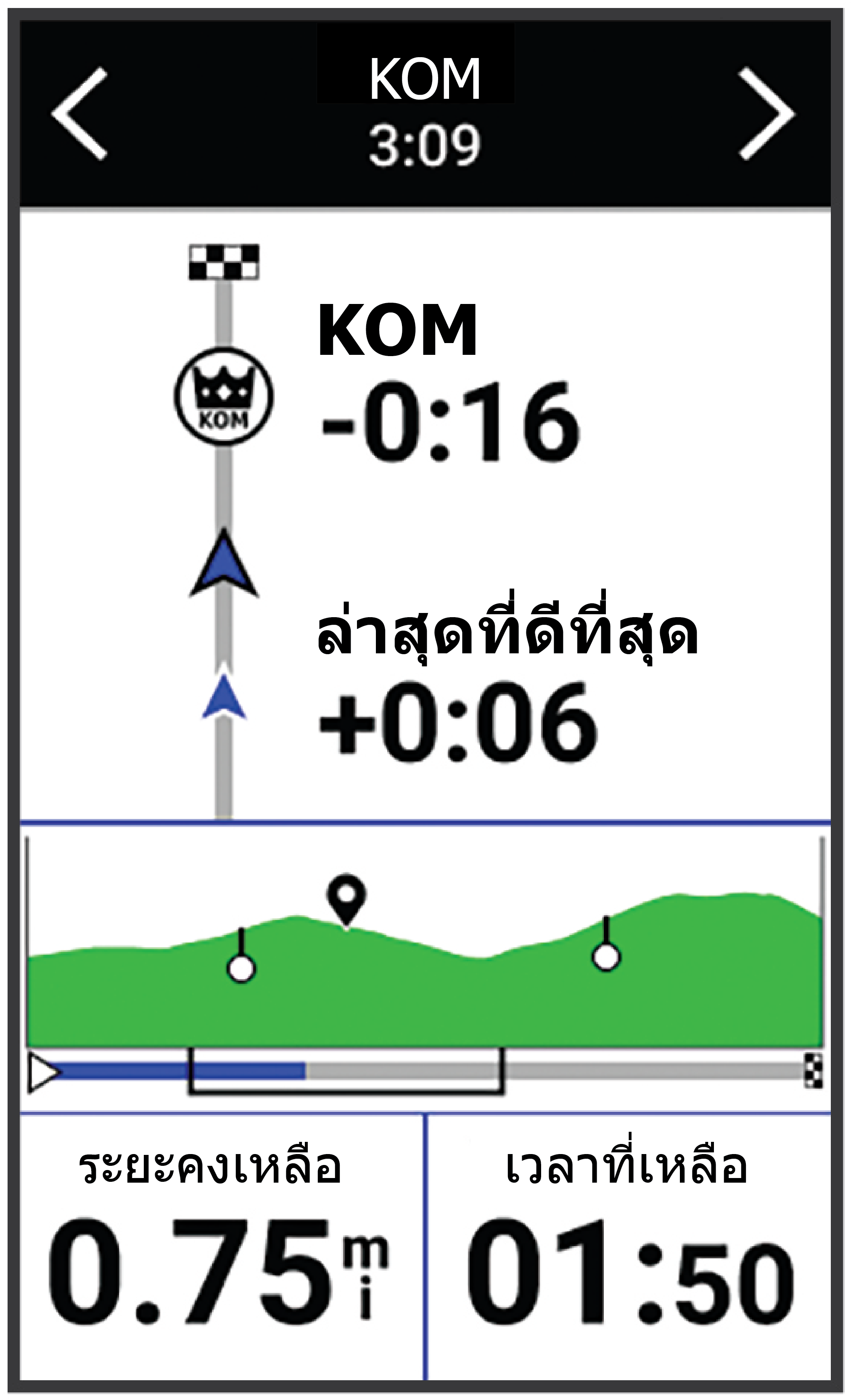 เซกเมนต์คือการแข่งขันคอร์สเสมือนจริง คุณสามารถแข่งขันในหนึ่งเซกเมนต์ และเปรียบเทียบสมรรถนะของคุณกับกิจกรรมในอดีต กับสมรรถนะของนักปั่นรายอื่น ๆ กับเพื่อน ๆ ในบัญชี Garmin Connect ของคุณ หรือสมาชิกคนอื่น ๆ ในชุมชนนักปั่น คุณสามารถอัปโหลดข้อมูลกิจกรรมของคุณไปยังบัญชี Garmin Connect ของคุณเพื่อดูตำแหน่งเซกเมนต์ของคุณได้