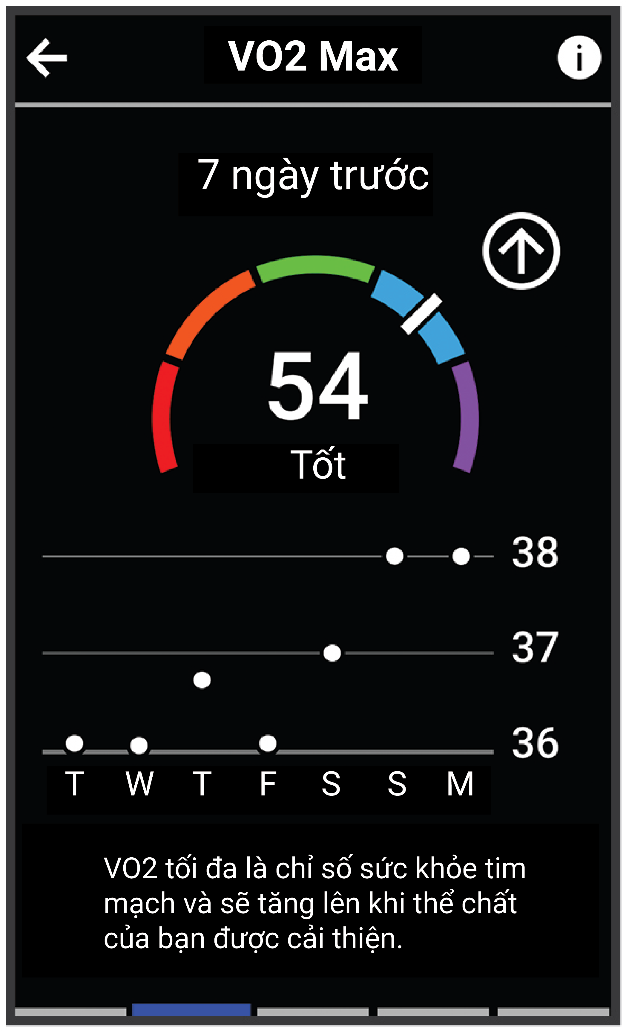 Ước tính VO2 tối đa hiển thị dưới dạng số và vị trí trên ứng dụng đo màu.
