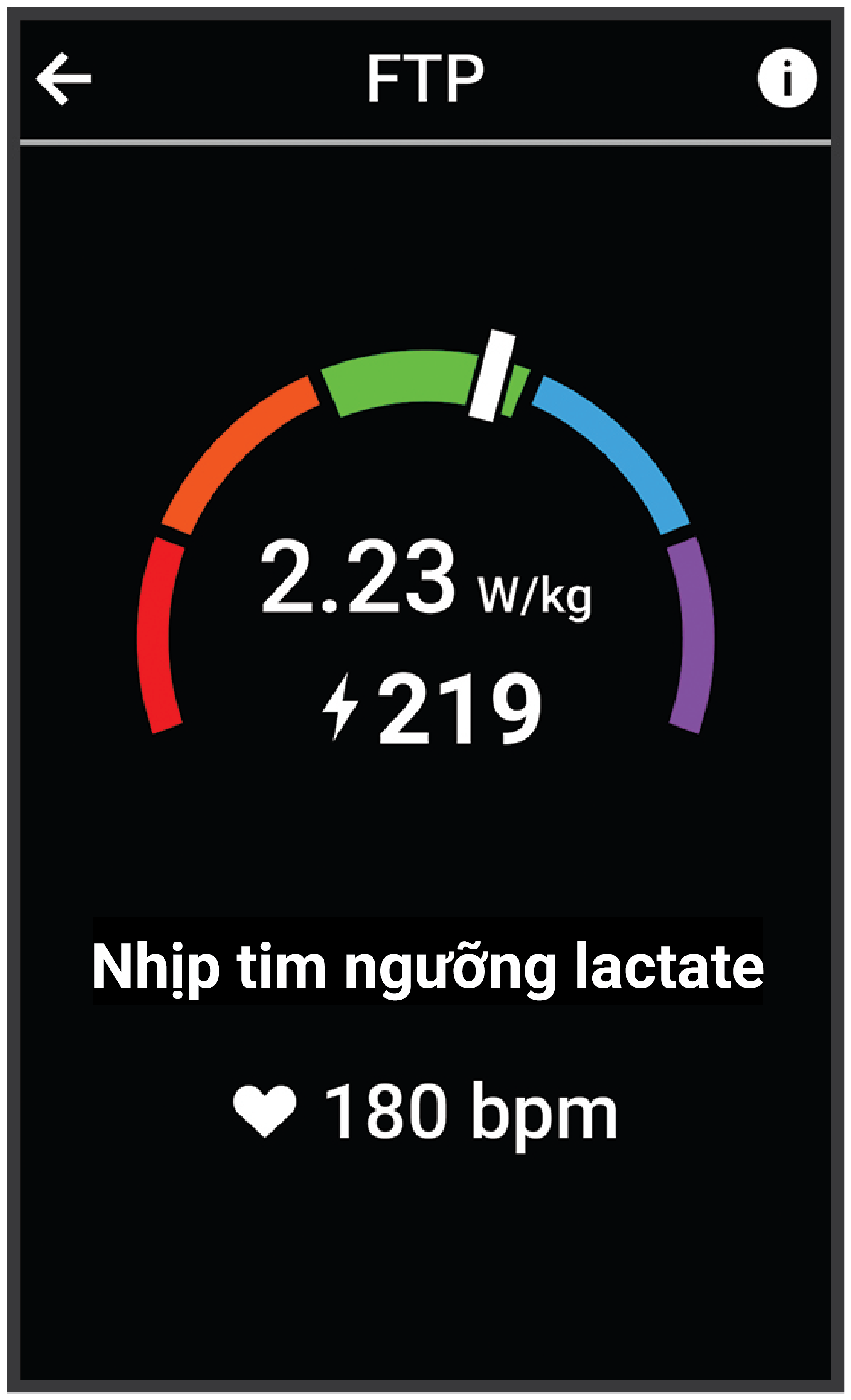 Thiết bị sử dụng thông tin hồ sơ người dùng của bạn từ thiết lập ban đầu để ước tính ngưỡng công suất hoạt động thể lực (FTP). Để có giá trị FTP chính xác hơn, bạn có thể tiến hành đo FTP, sử dụng dụng cụ đo công suất và cảm biến nhịp tim đã được ghép đôi (Thực hiện kiểm tra FTP).