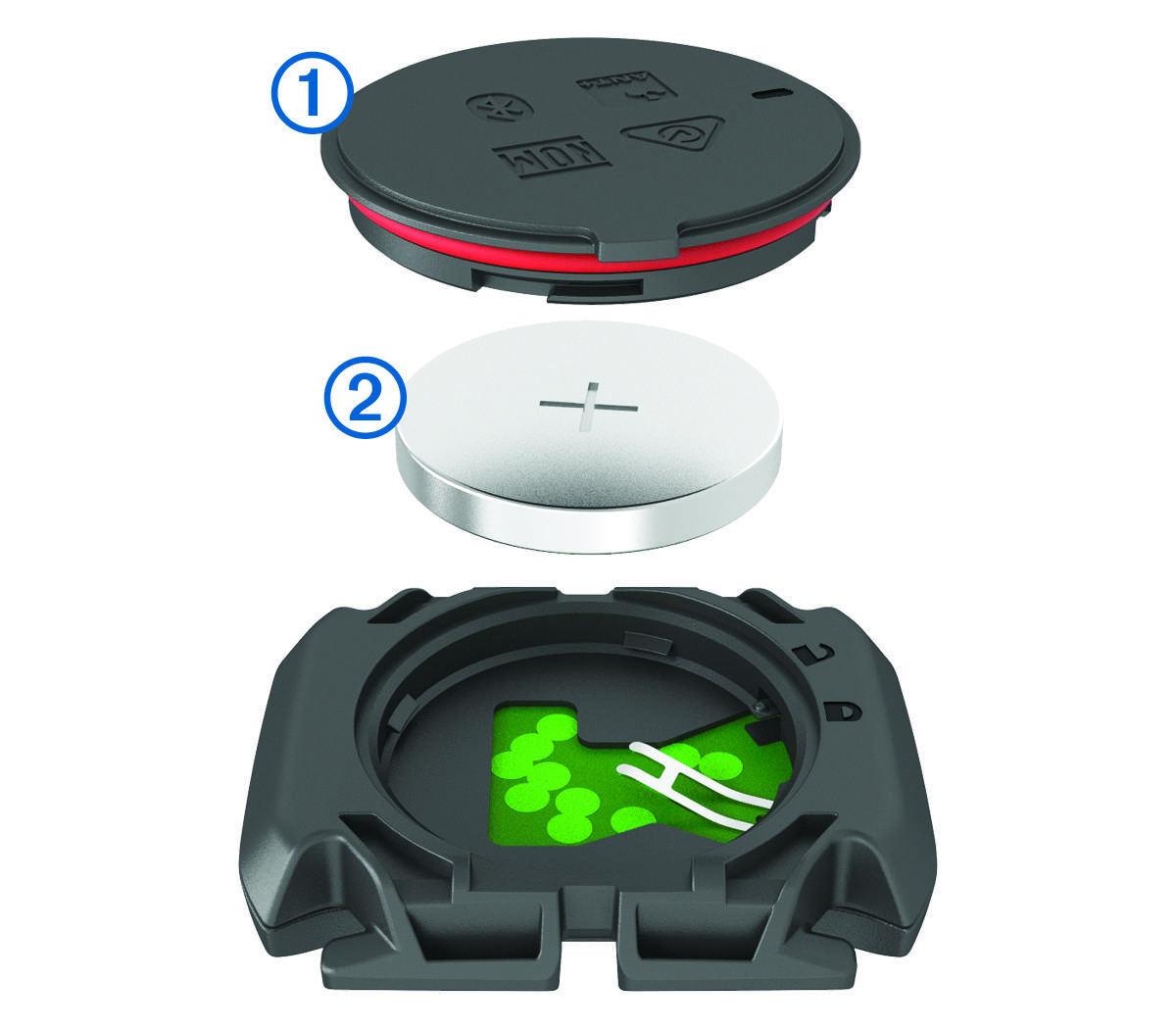 更换踏频传感器电池设备使用 CR2032 电池。车轮转动两圈后,LED 灯闪烁红色代表电池电量低。 找到传感器背面的圆形电池盖 ① 。 逆时针旋转电池盖,直到箭头指向解锁图示且电池盖松动到可以拆下为止。 移除电池盖与电池 ② 。 等待 30 秒钟。 确认正负极后放入新的电池。 注意:请勿损坏或遗失 O 型垫圈。 顺时针旋转电池盖直到箭头指向上锁图示。 注意:更换电池后,LED 指示灯会红绿交替闪烁几秒。当 LED 指示灯呈绿色闪烁然后停止闪烁时代表传感器已启动并准备传输数据。 主页设备信息更换电池更换踏频传感器电池