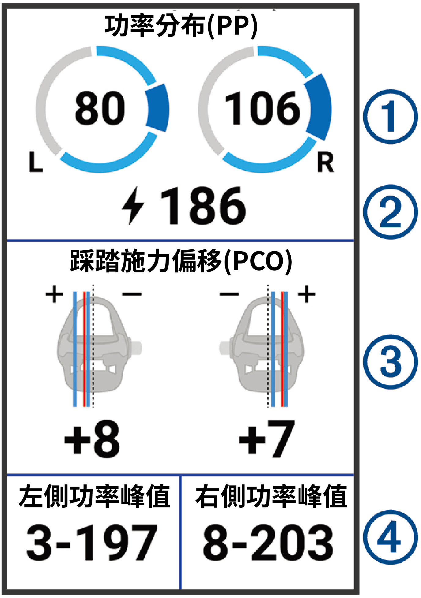 騎乘動態數據可測量您踩踏時如何發力,以及發力的位置,讓您更了解自己的騎乘方式。了解自己發力的方式及位置可以讓您更有效地訓練,並檢查腳踏車是否合身。