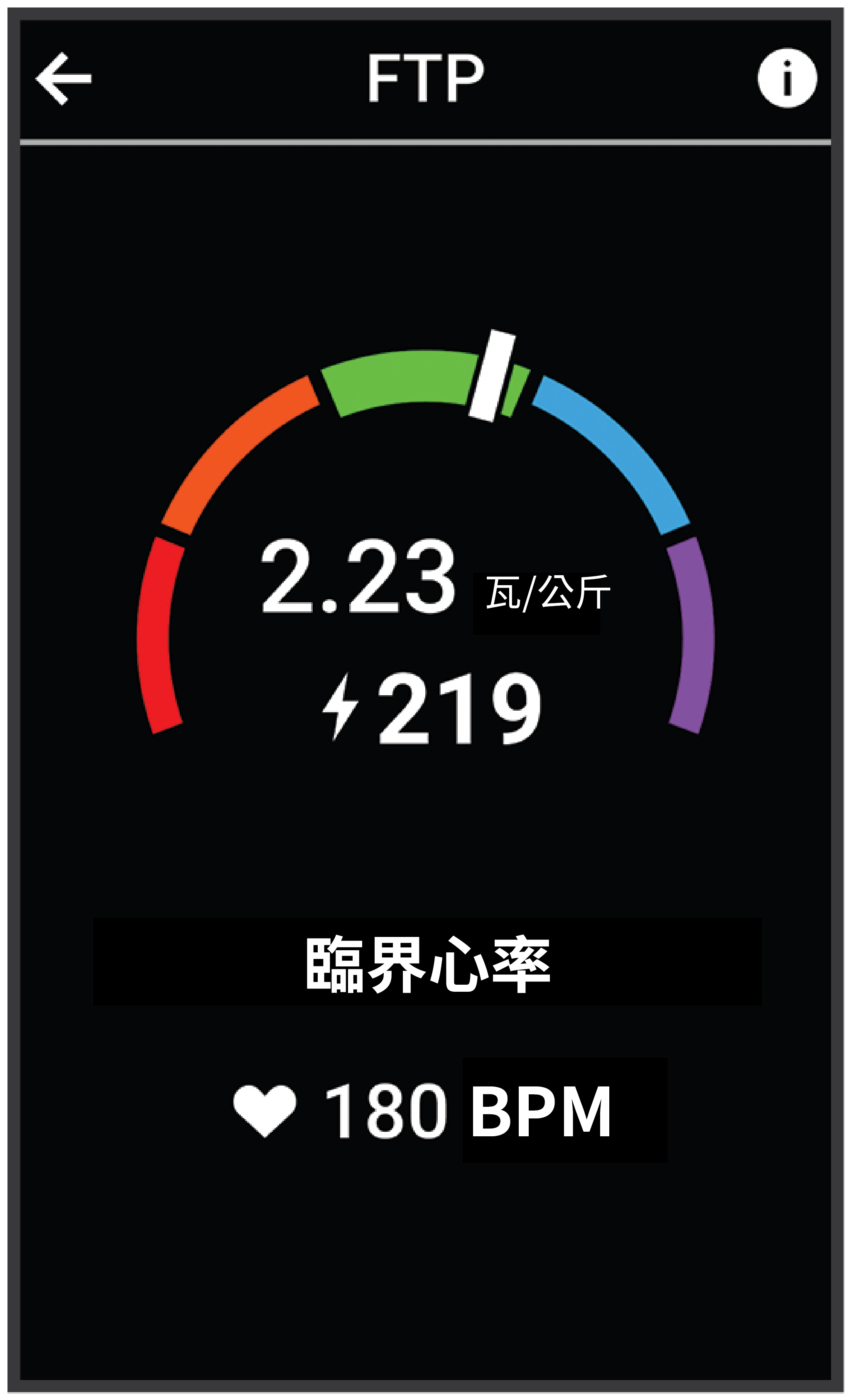 您的 FTP 估算會以每公斤瓦特的數值、您的輸出功率(瓦)以及色彩量表的位置顯示。
