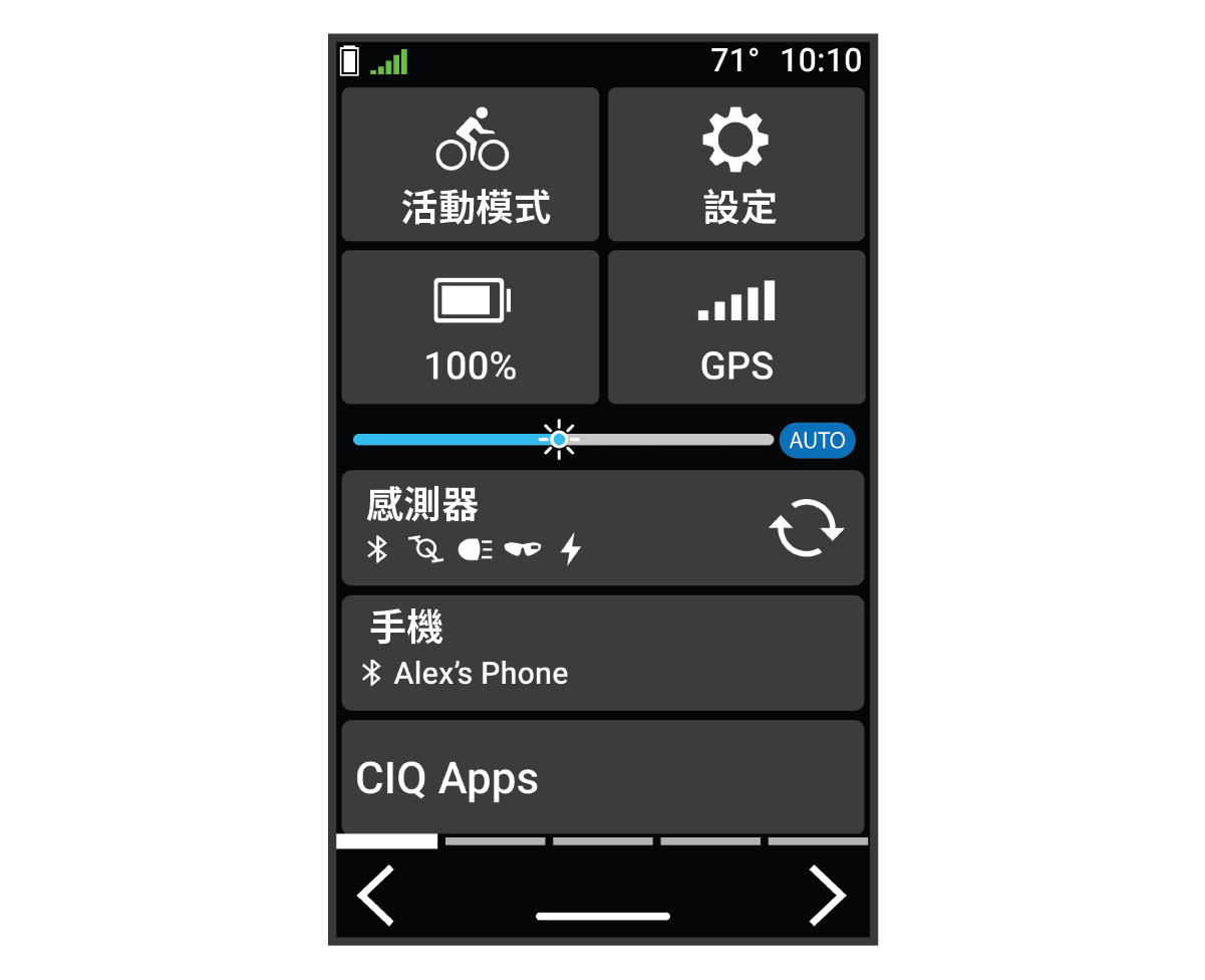 檢視 Widget 小工具裝置出廠時已預載多個小工具。配對手機或其它相容裝置時,還有更多小工具可供使用。 在主畫面,從螢幕頂端向下滑。 出現設定小工具。閃爍的圖示代表裝置正在搜尋訊號。實心的圖示代表訊號已找到或感測器已連結。選擇任一圖示以變更其設定。 向左或向右滑以檢視更多小工具。 下一次滑動螢幕檢視小工具時,會顯示您上一次最後檢視的小工具。首頁產品介紹裝置介紹檢視 Widget 小工具