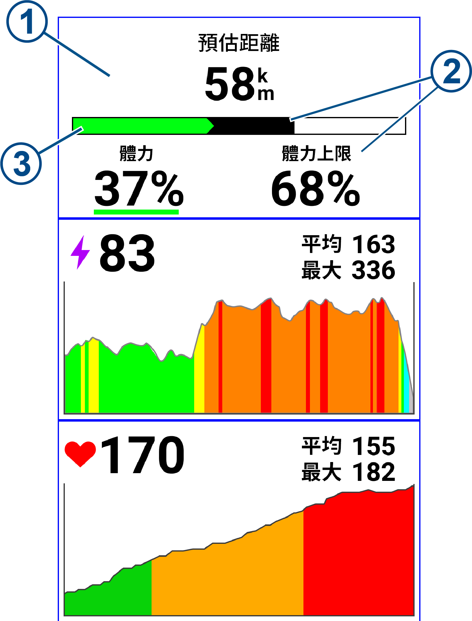 主要體力資料欄位。您可以檢視在目前出力下預估耗盡體力前所剩的時間或距離。 |