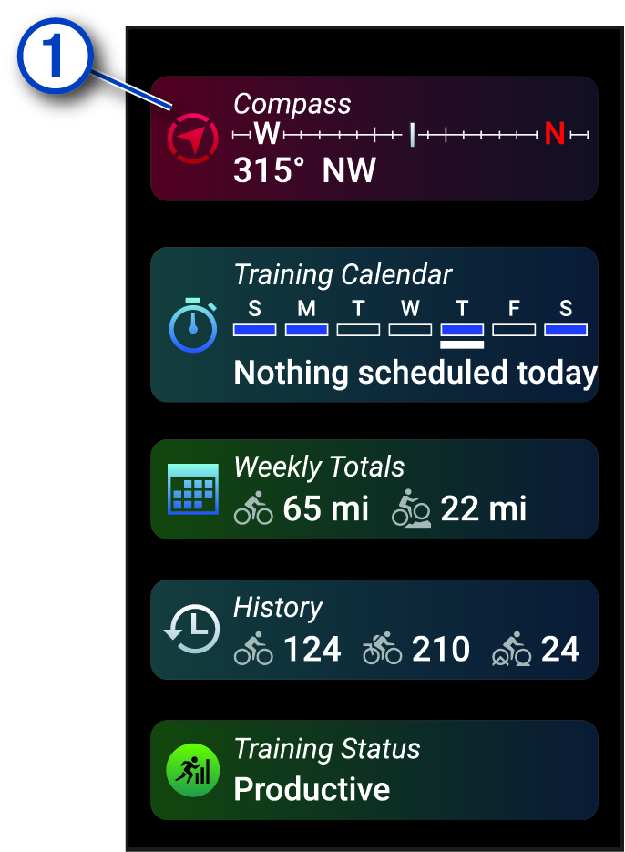 Viewing GlancesGlances provide quick access to health data, activity information, built-in sensors, and more. From the home screen, swipe up. The device scrolls through the glances. Select a glance to view additional information. Select to customize the glances (). HomeIntroductionDevice OverviewViewing Glances
