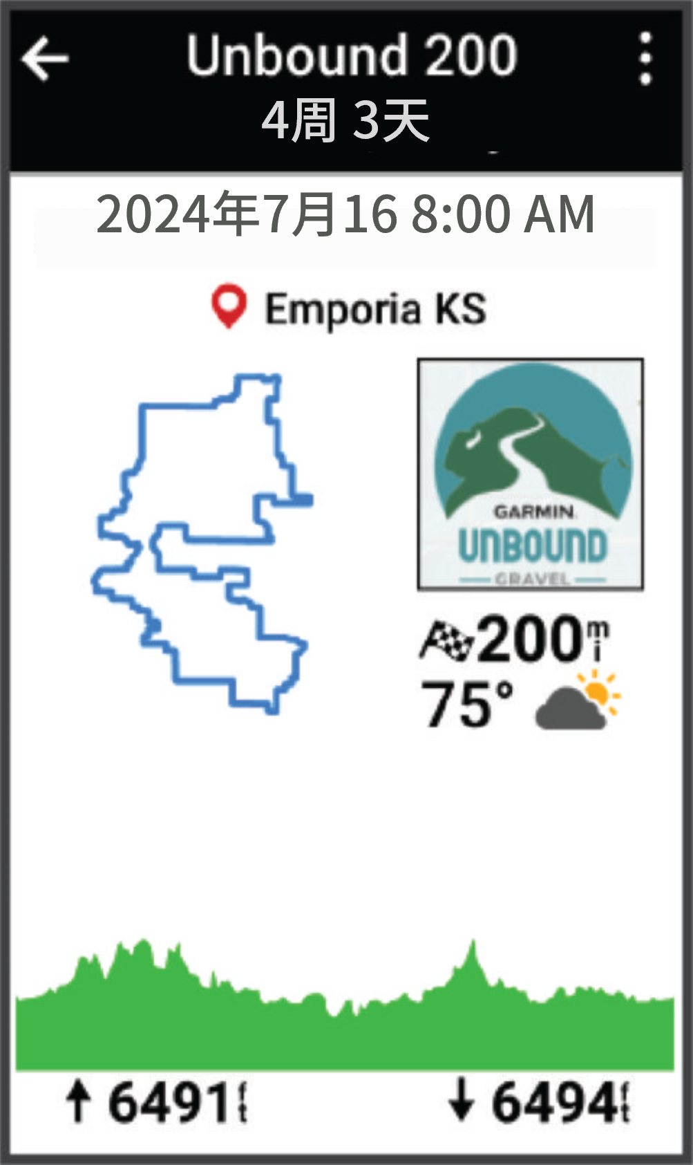 当在您的 Garmin Connect 日历中添加赛事时,您可以通过添加主要赛事概览在 Edge 设备中查看此赛事(自定义小工具,第31页)。赛事日期必须在未来 365 天内。设备会显示赛事倒计时、赛事时间和地点、路线详情(如有),以及天气信息。