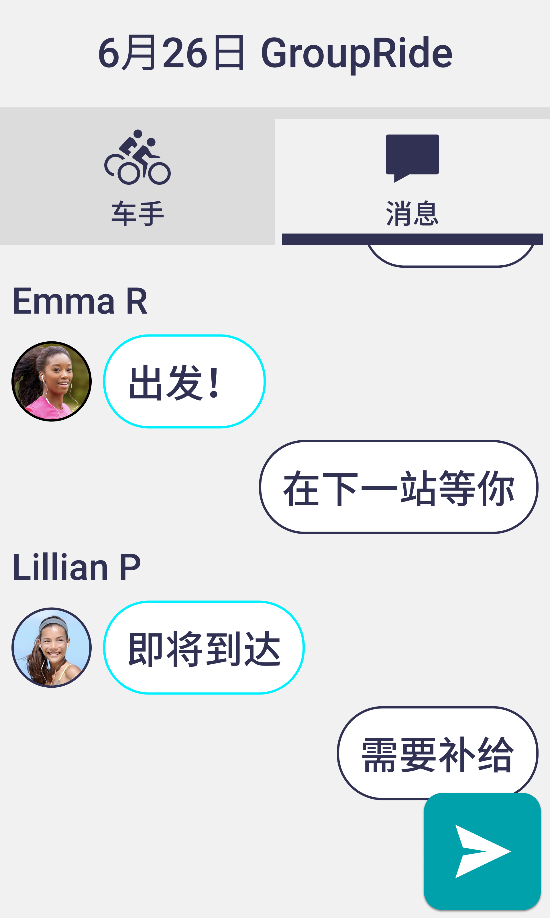 您可在 GroupRide 团骑期间向其他车友发送消息。