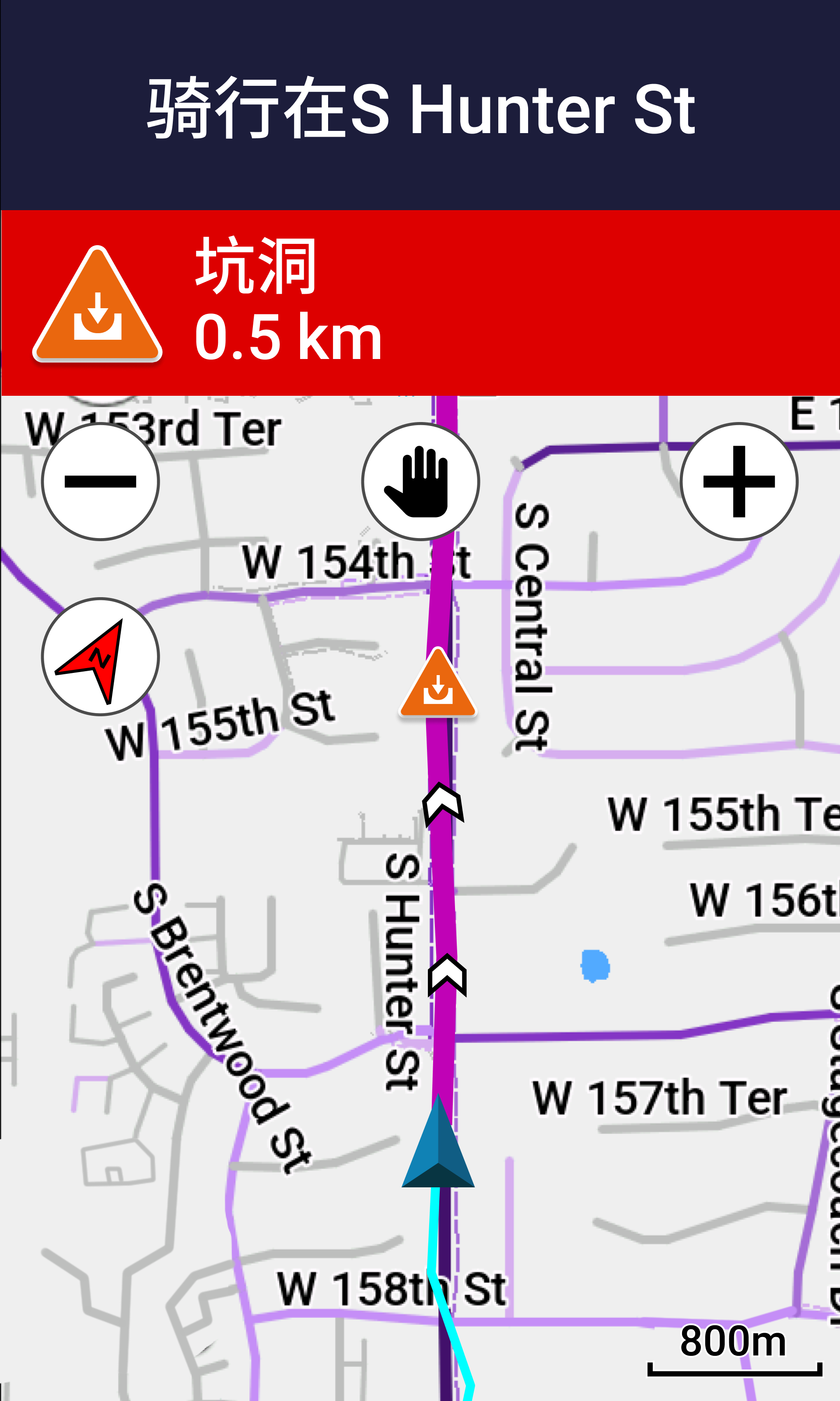 在骑行过程中,您可以随时报告可能对骑行者造成危害的危险,例如坑洞、未拴绳的狗或倒下的树木。您还可以在 Edge 设备上报告危险区是否存在,或报告危险已解除。在一段时间内此处未报告为危险区,则危险提示将消除。