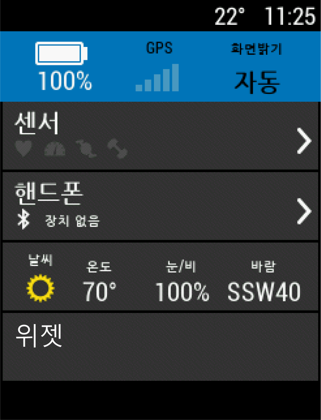상태 페이지 보기상태 페이지는 GPS, 무선 센서, 스마트폰의 연결 상태를 화면에 표시합니다.옵션을 선택합니다: 홈 화면에서 를 누릅니다. 라이딩 시 > 상태 페이지를 선택합니다. 상태 페이지가 나타납니다. 점멸하는 아이콘은 장치가 신호를 찾고 있음을 의미합니다. 점멸하지 않는 아이콘은 신호를 찾았거나 센서가 연결되었음을 의미합니다.홈소개장치 개요상태 페이지 보기