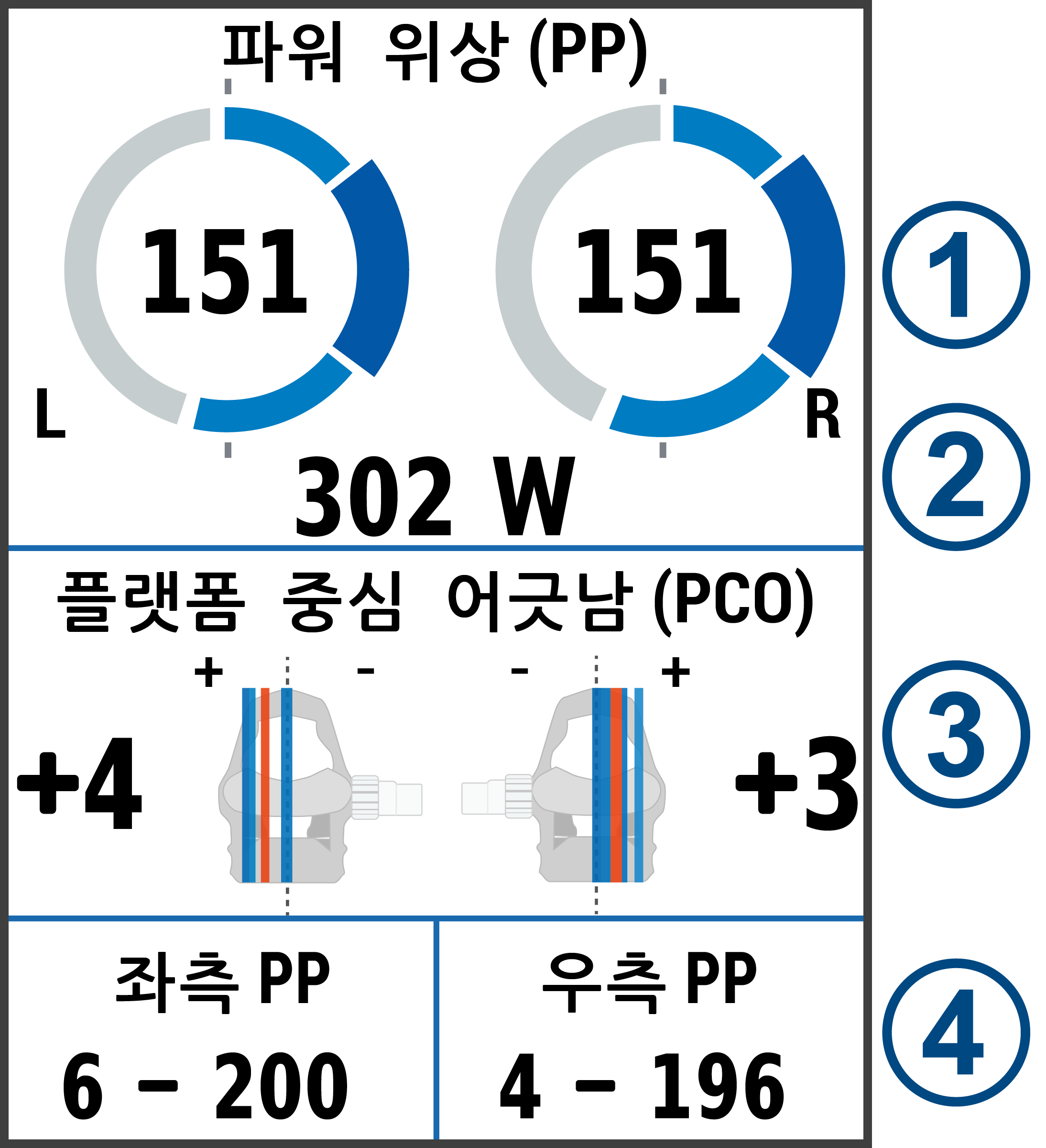- 사이클링 역학관계 화면으로 스크롤하여 파워단계 최고점①, 총 파워 단계 ②, 플랫폼 센터 오프셋 ③을 확인합니다.