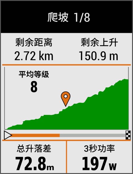 ClimbPro 功能帮助您为路线前方的爬坡分配体力。在骑行前,你可以查看爬坡的详细资料,包含爬坡出现的时间、平均坡度及总升落差。依照爬坡距离及坡度分类的爬坡类别会以不同的颜色显示。