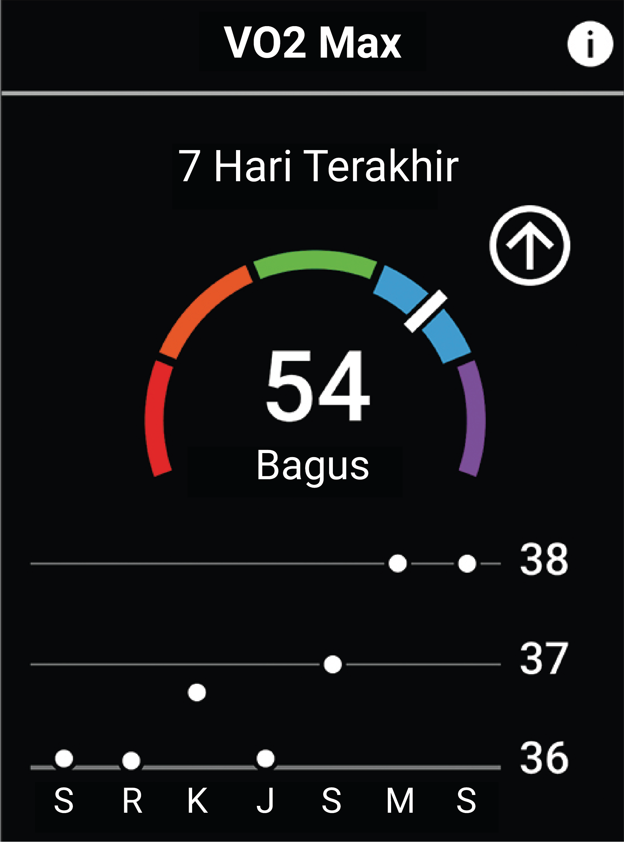 untuk melihat VO2 max. Anda.VO2 max. Anda perkiraan muncul sebagai angka dan posisi pada pengukur warna.
