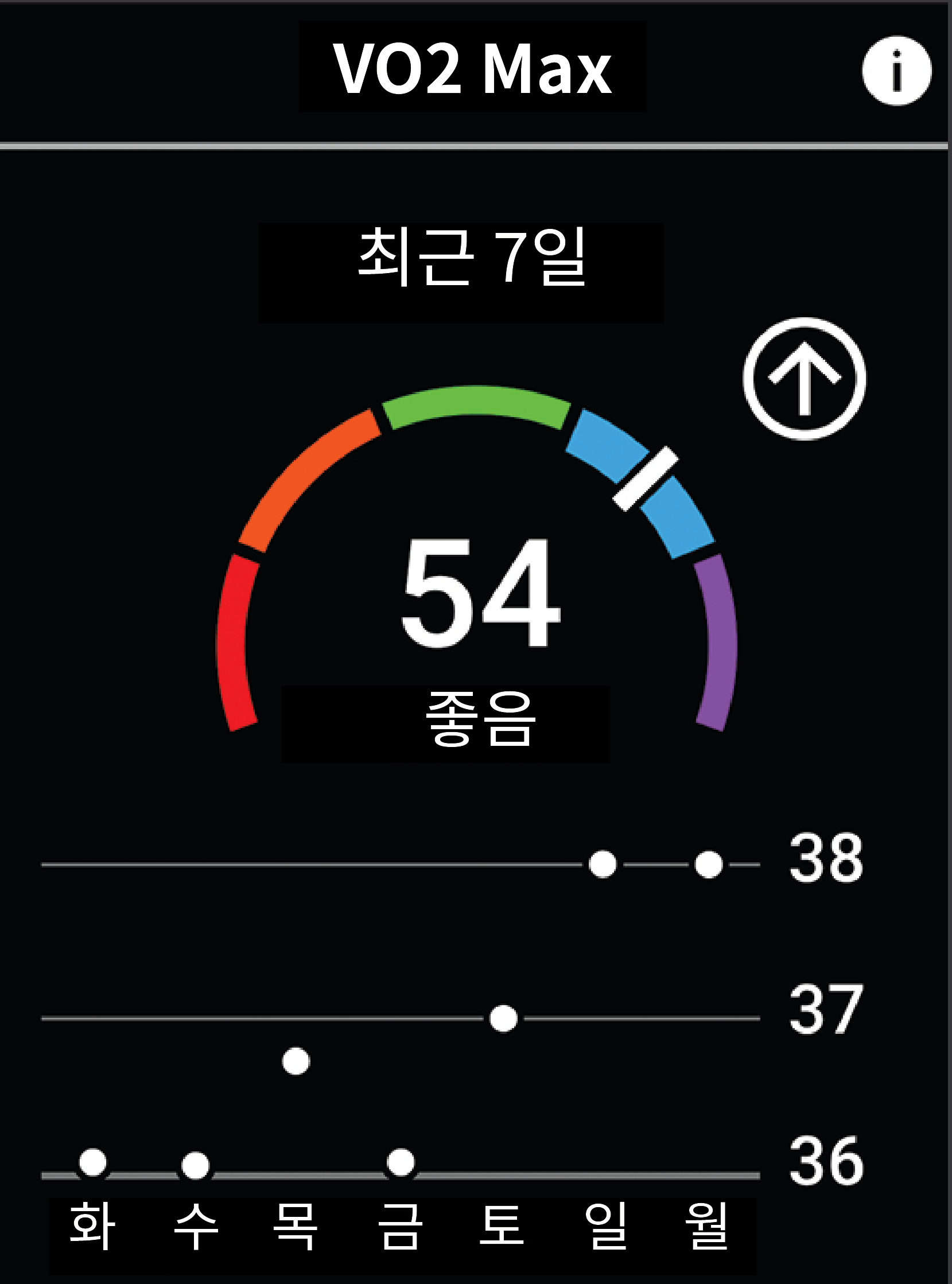 VO2 max. 추정치는 수치와 색상 게이지 상의 위치로 표시됩니다.