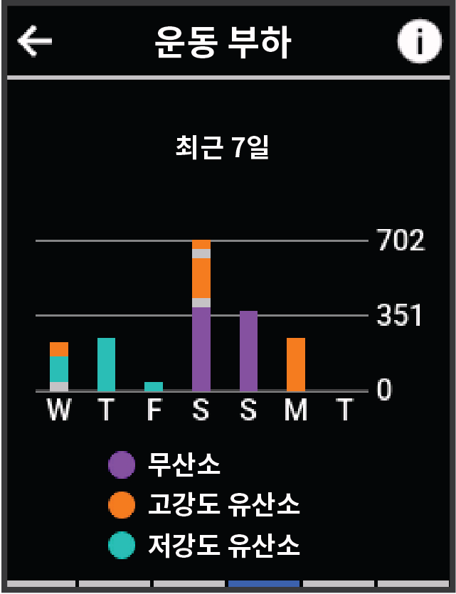 운동 부하 추정치를 확인하려면 먼저 심박수 모니터를 착용하고, 파워미터를 설치하고, 이들을 장치와 페어링해야 합니다(22 페이지, 무선 센서 페어링하기).