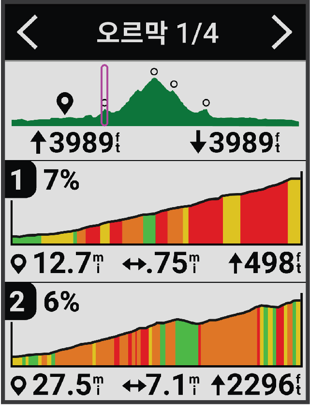 ClimbPro 기능은 경로의 다음 오르막을 위해체력을 관리하는 데 도움이 됩니다. 오르막이 나타나는 시점, 평균 경사도, 총 상승 거리를 포함하여 오르막에 대한 상세 정보를 확인할 수 있습니다. 오르막의 범주는 길이와 경사도를 기준으로 하여, 색깔로 표시됩니다(15 페이지, 오르막 카테고리).