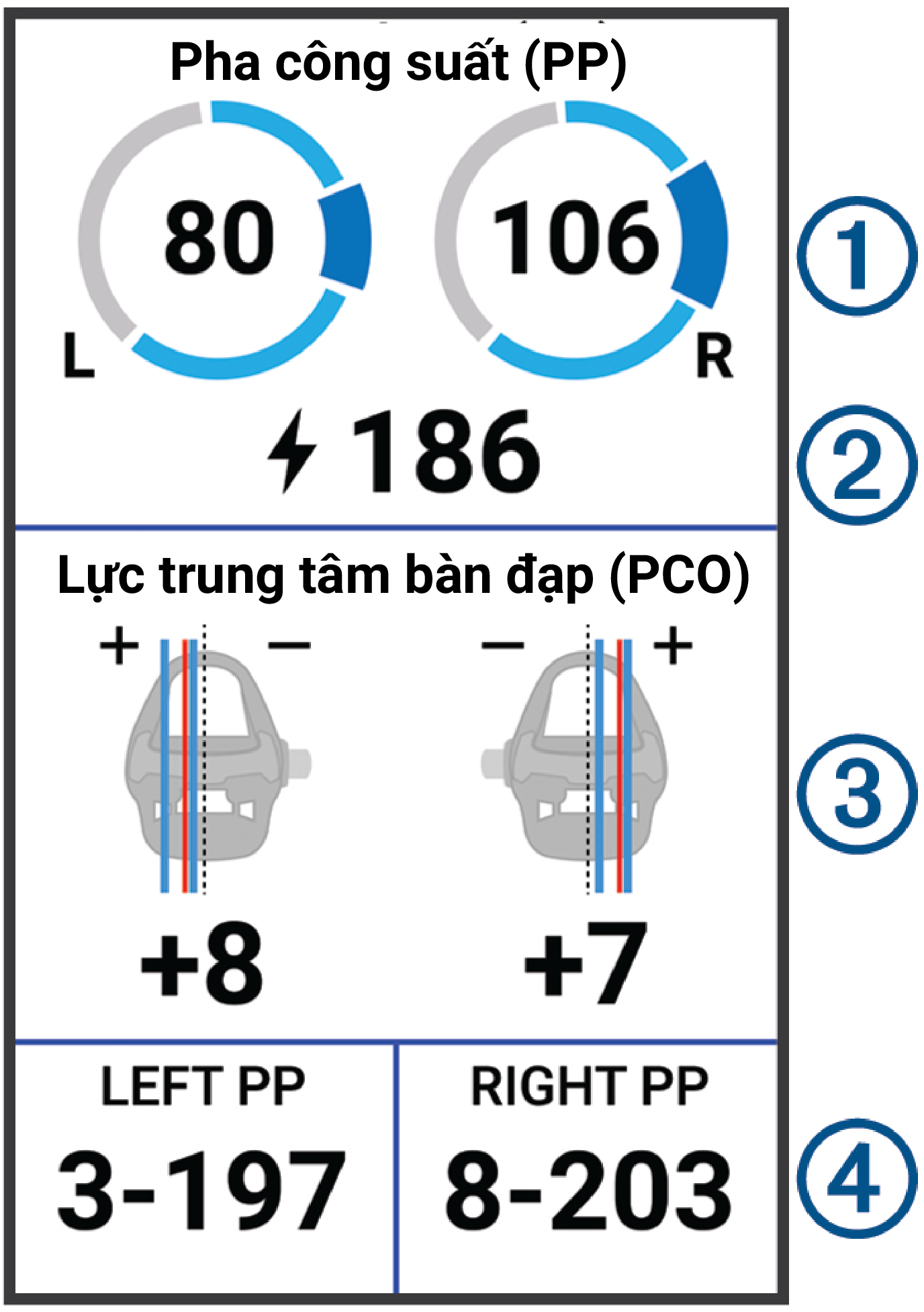 LƯU Ý: Bạn phải có thiết bị đo công suất cảm biến kép được kết nối bằng công nghệ ANT + để sử dụng các số liệu về trạng thái đạp xe.
