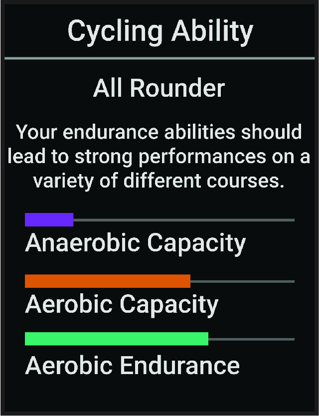 Cycling ability is a measurement of your performance across three categories: aerobic endurance, aerobic capacity, and anaerobic capacity. Cycling ability includes your current rider type, such as climber. Information you enter in your user profile, such as body weight, also helps determine your rider type (Setting Up Your User Profile).