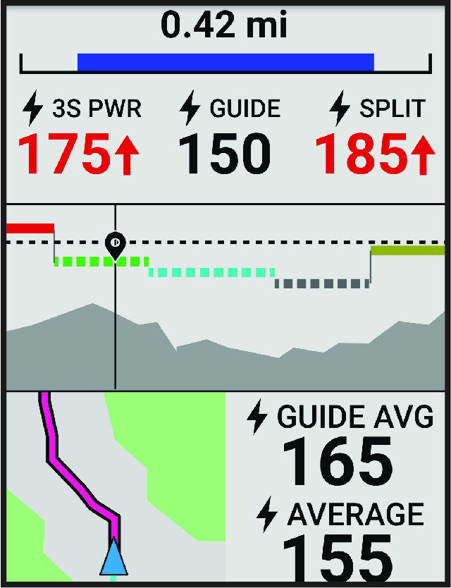 Power guides are always associated with a course and cannot be used with workouts or segments. You can view and edit your strategy in Garmin Connect and sync it with compatible Garmin devices. This feature requires a power meter, which must be paired with your device (Pairing Your Wireless Sensors). After the devices are paired, you can customize the optional data fields (Data Fields).