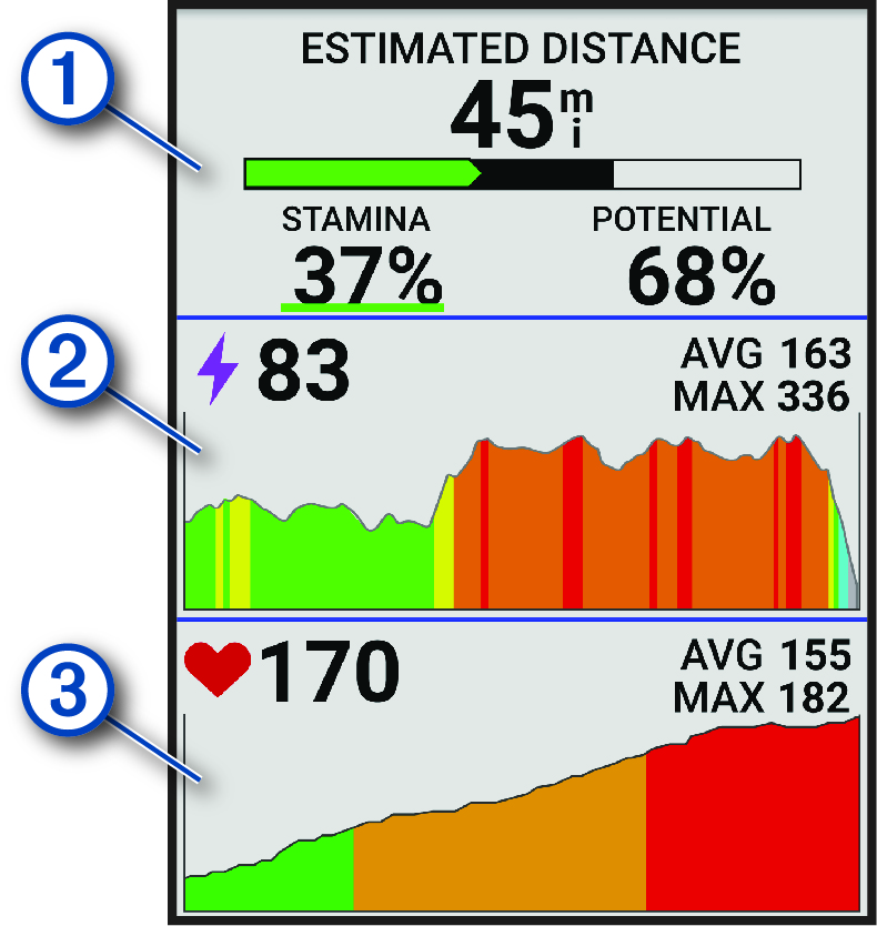 Potential stamina estimate. Think of potential stamina as the total capacity of your fuel tank. It will decrease quickly if you are riding at a high effort level. Reducing your effort or resting results in a slower decline of your potential stamina. |