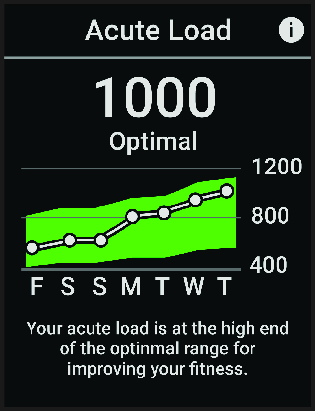 Acute load is a weighted sum of your excess post-exercise oxygen consumption (EPOC) for the last several days. The gauge indicates whether your current load is low, optimal, high, or very high. The optimal range is based on your individual fitness level and training history. The range adjusts as your training time and intensity increase or decrease.