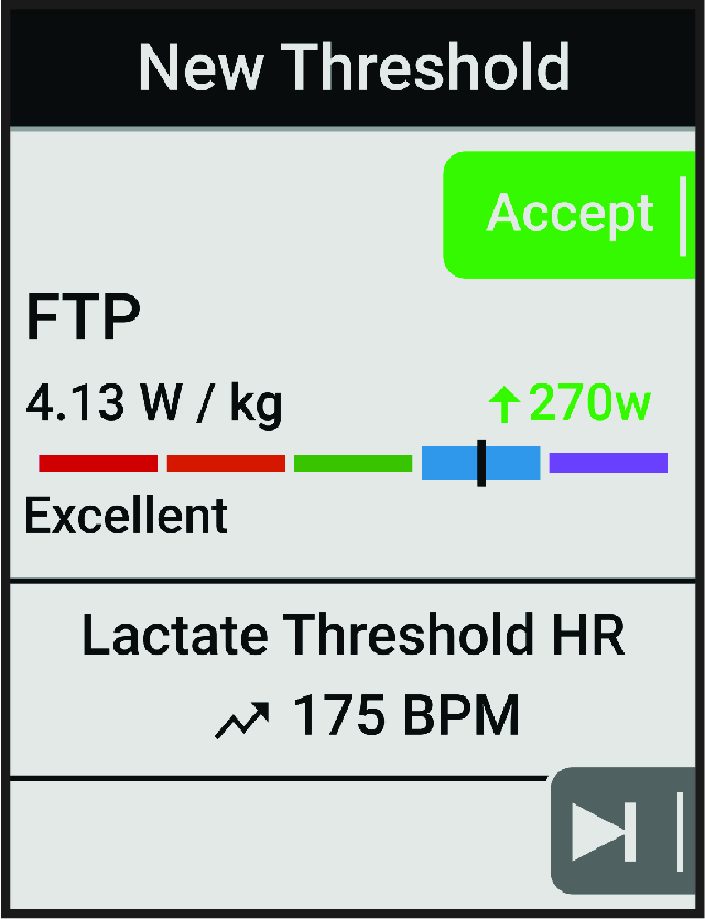 The device uses your user profile information from the initial setup to estimate your functional threshold power (FTP). For a more accurate FTP value, you can conduct an FTP test using a paired power meter and heart rate monitor (Conducting an FTP Test).