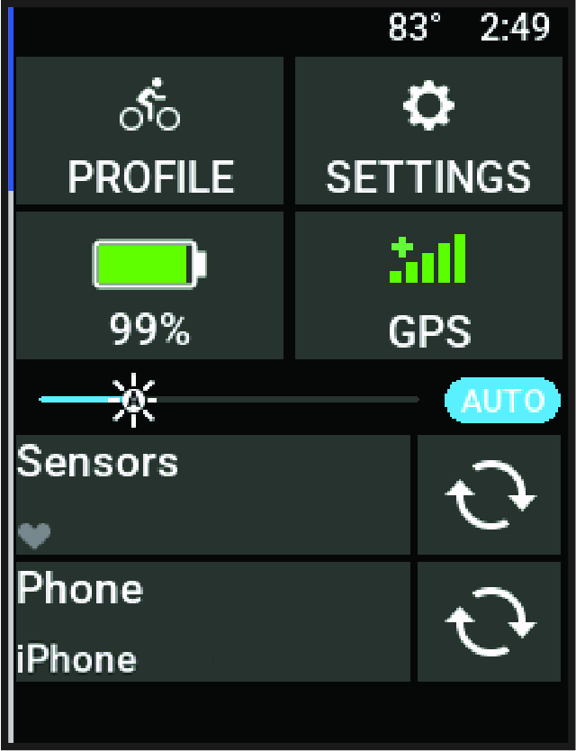 The settings widget appears. A flashing icon means the device is searching for a signal. A solid icon means the signal was found or the sensor is connected. You can select any icon to change the settings.