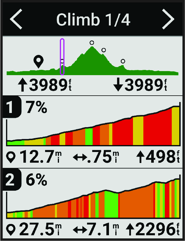 Fitur ClimbPro membantu Anda mengelola usaha Anda untuk kenaikan mendatang pada sebuah jalur. Anda dapat melihat detail tentang tanjakan, termasuk kapan tanjakan terjadi, rata-rata kemiringan, dan total tanjakan. Skor tanjakan, berdasarkan panjang dan kemiringan, diindikasikan berdasarkan warna (Kategori Tanjakan, halaman 19).