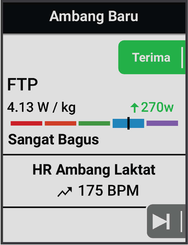 Perangkat ini menggunakan informasi profil pengguna Anda dari pengaturan awal untuk memperkirakan daya ambang fungsional (FTP) Anda. Untuk pengukuran nilai FTP yang lebih akurat, Anda dapat melakukan tes FTP menggunakan pengukur daya dan monitor denyut jantung yang dihubungkan (Melakukan Tes FTP, halaman 12).
