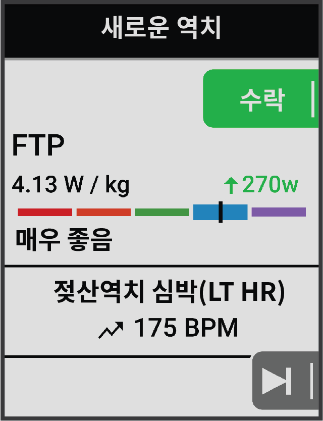 FTP는 킬로그램당 와트로 측정된 값으로 표시되며 파워 출력(와트)과 색상 게이지에 있는 위치를 표시합니다.