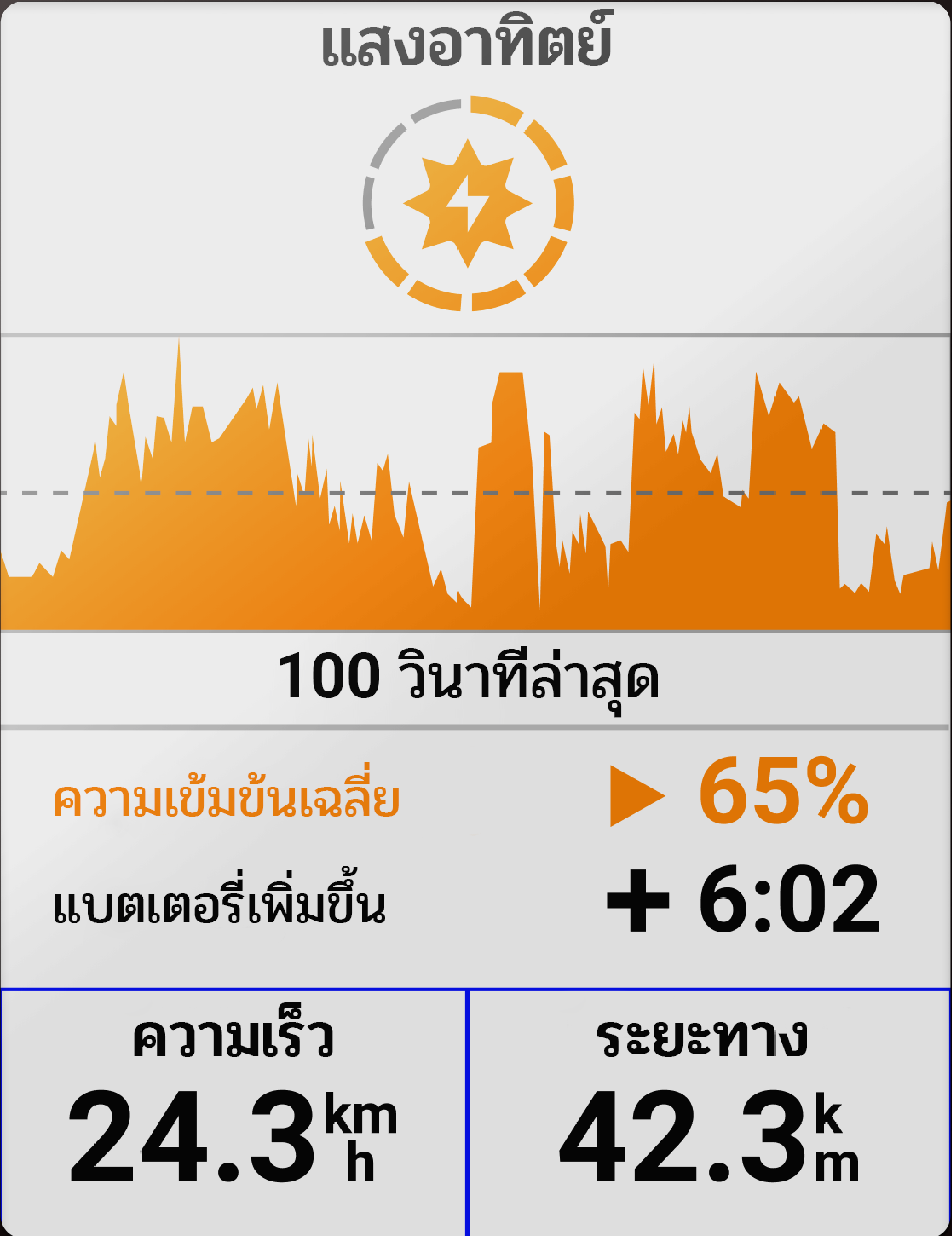 หน้าข้อมูลโซลาร์ไฮไลท์ความเข้มข้นของสภาพแสงปัจจุบันและเวลาการปั่นสะสมที่ได้จากพลังงานแสงอาทิตย์ การคำนึงถึงการใช้งานปัจจุบันและการใช้แบตเตอรี่ของอุปกรณ์