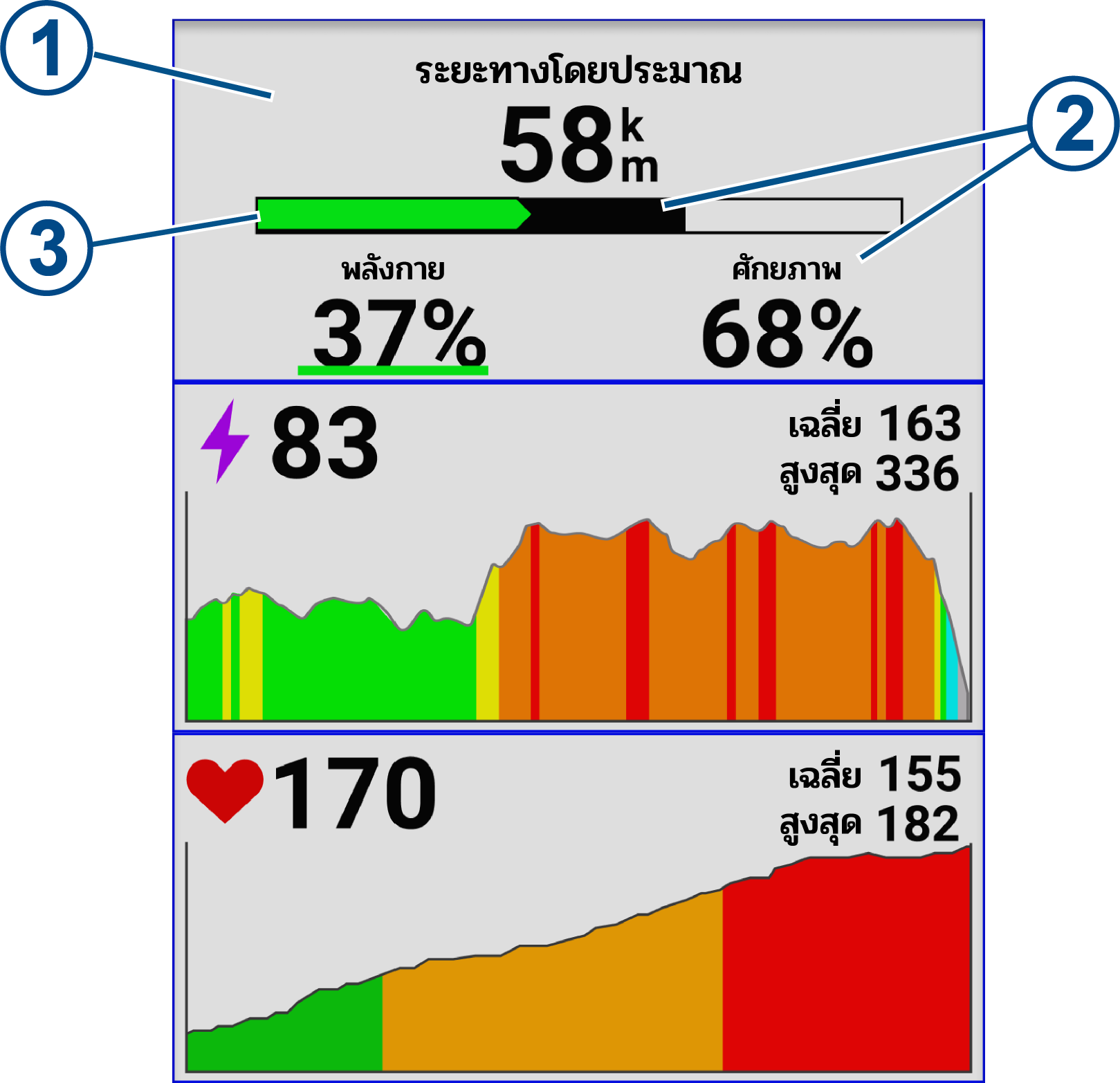 ช่องข้อมูลพละกำลังหลัก คุณสามารถดูเวลาประมาณหรือระยะทางที่เหลือจนกว่าคุณจะใช้ระดับการออกแรงปัจจุบันจนหมด |