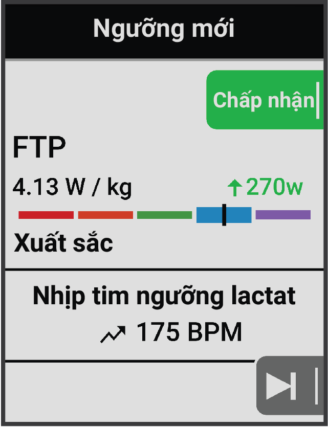 Thiết bị sử dụng thông tin hồ sơ người dùng của bạn từ thiết lập ban đầu để ước tính ngưỡng công suất hoạt động thể lực (FTP). Để có giá trị FTP chính xác hơn, bạn có thể tiến hành đo FTP, sử dụng dụng cụ đo công suất và cảm biến nhịp tim đã được ghép đôi (Thực hiện kiểm tra FTP).