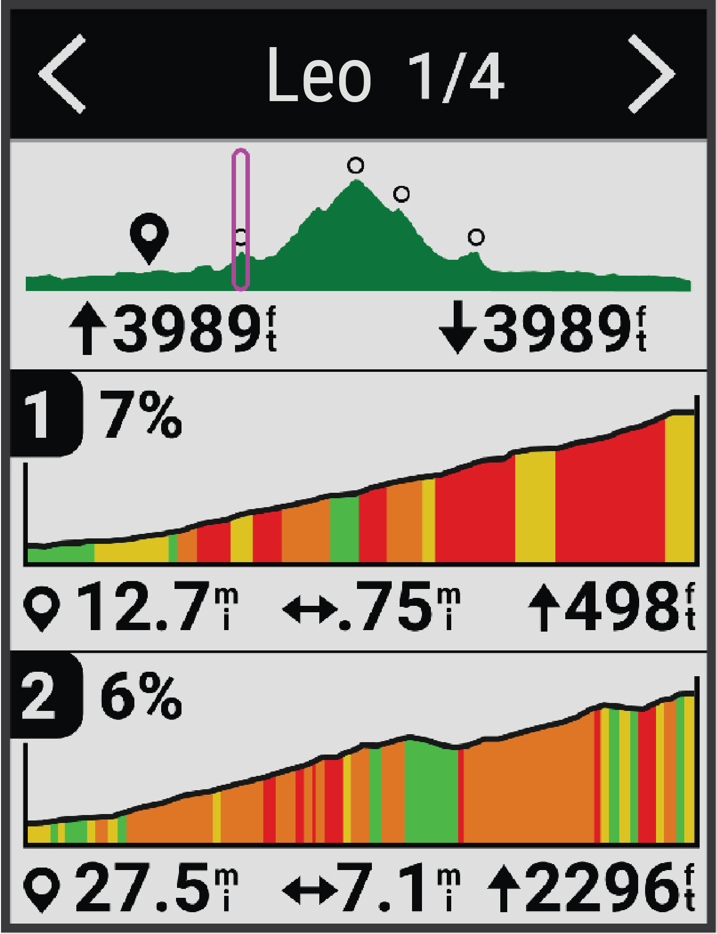Tính năng ClimbPro giúp bạn quản lý nỗ lực của mình cho các con dốc sắp tới. Bạn có thể xem chi tiết về các con dốc, bao gồm khi chúng xảy ra, độ dốc trung bình và tổng độ dốc. Điểm số leo núi, dựa trên chiều dài và độ dốc, được chỉ định bằng màu sắc (Danh mục dốc).