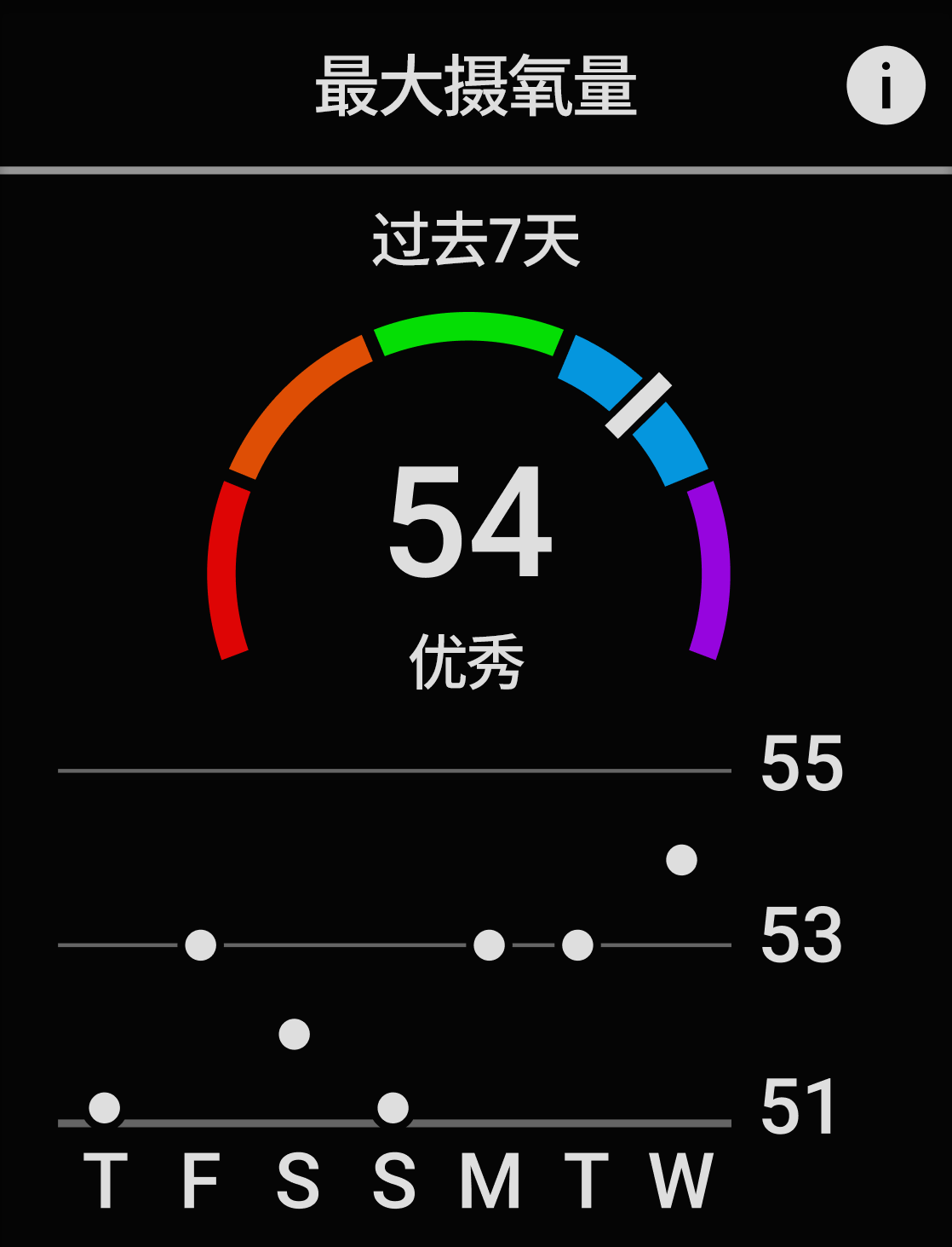 最大摄氧量估算会以数字的形式显示,还会显示在彩色量表上。