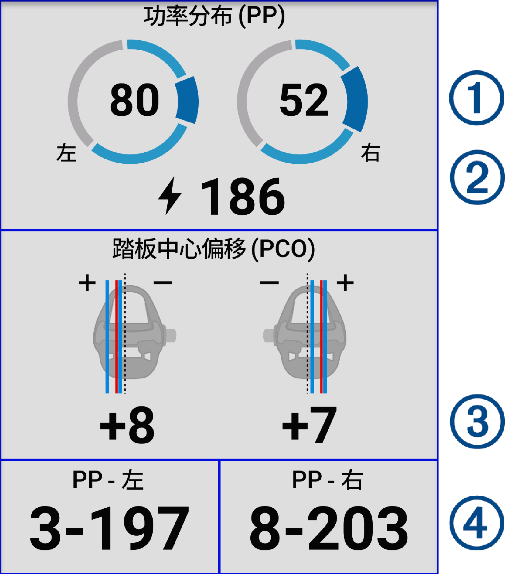 - 滑动屏幕到骑行动态页面,以查看您的功率峰值分布 ①、功率总值 ② 和踩踏施力偏移 ③。